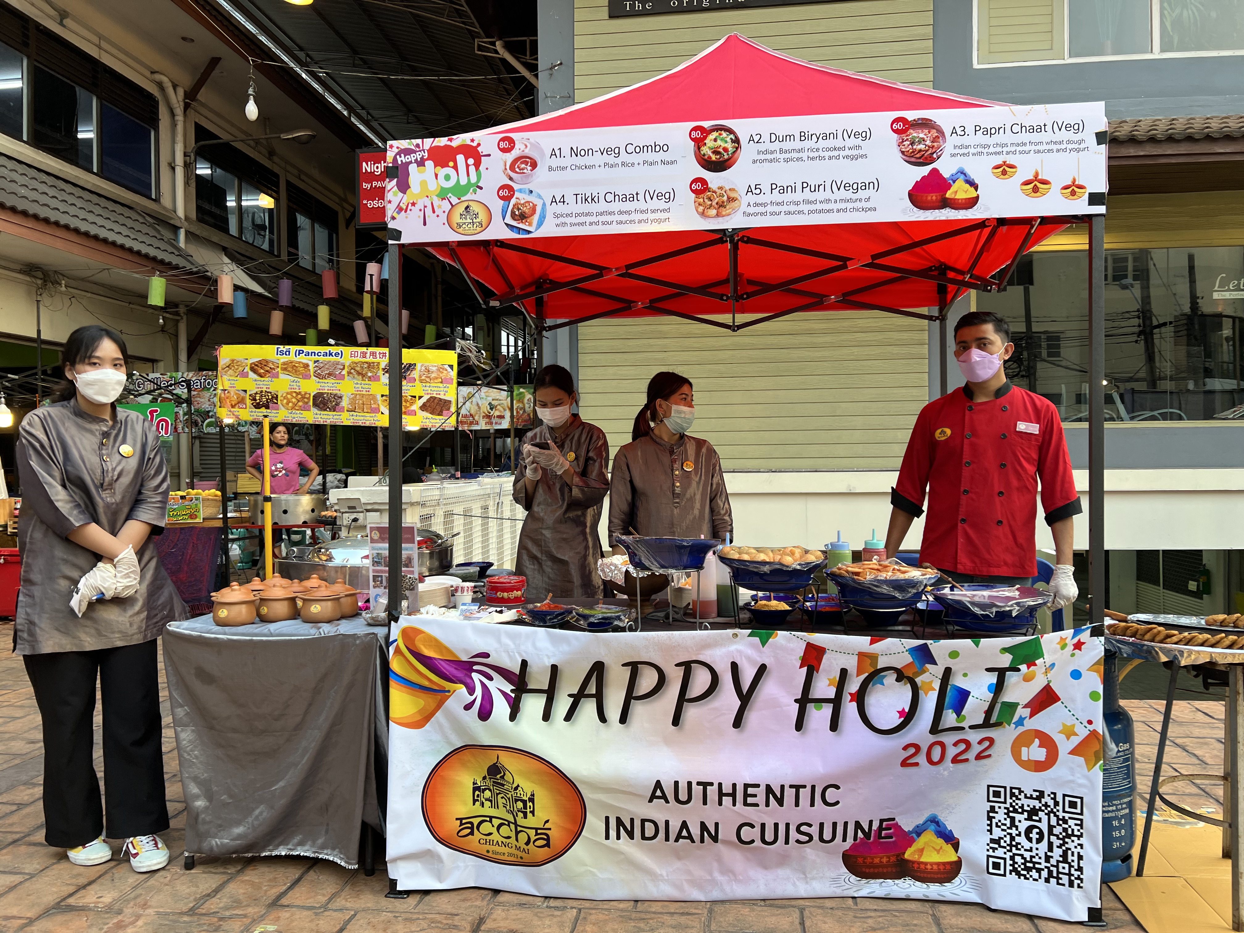 Chiang Mai hosted Holi at the Pavilion Night Bazaar this past weekend. The smells of Indian food, from dosas to pani puri to dum biryani, coaxed curious passersby into the plaza. Other attendees came prepared, donning white clothes that would soon become Jackson Pollock canvases in a matter of hours.