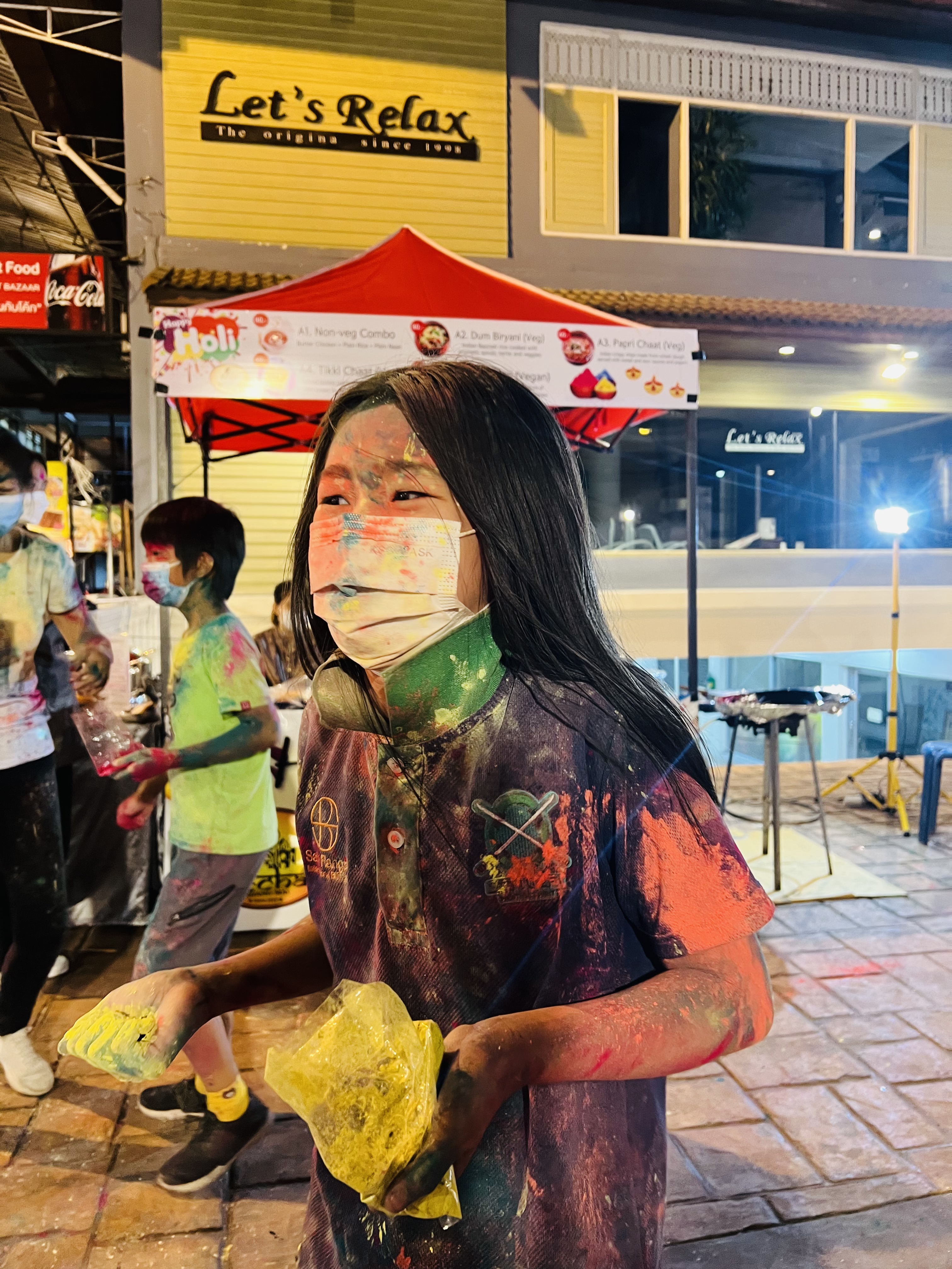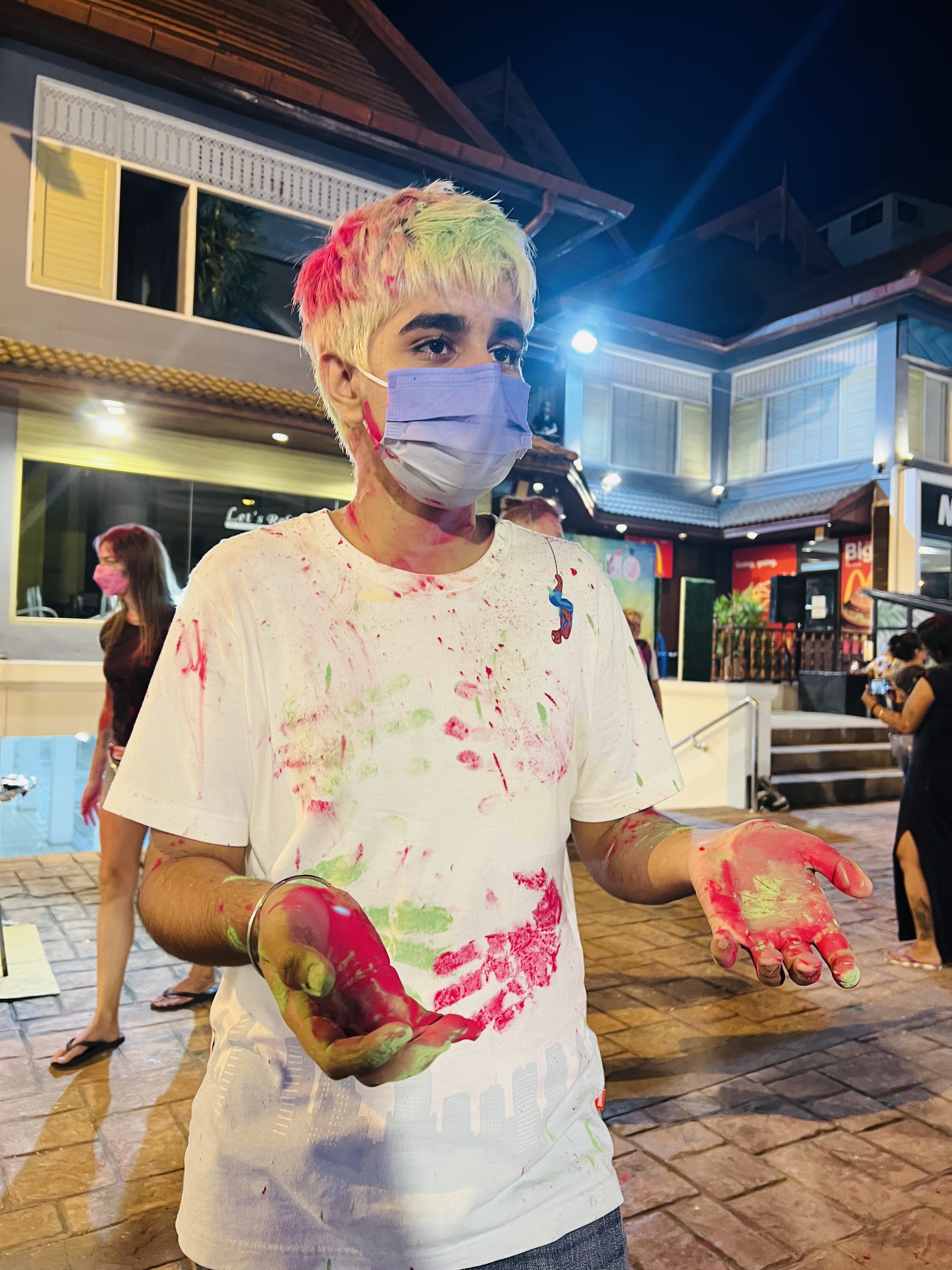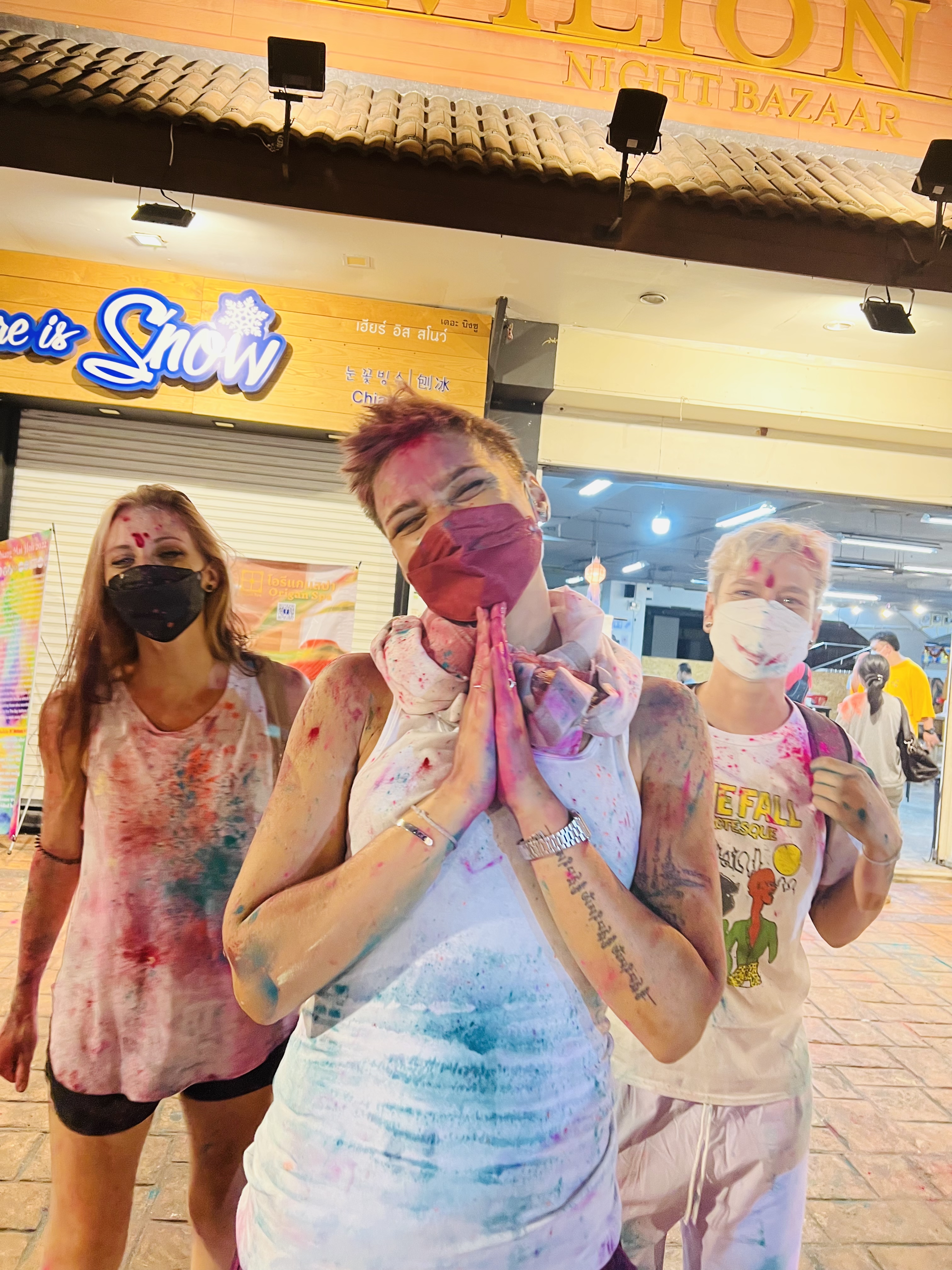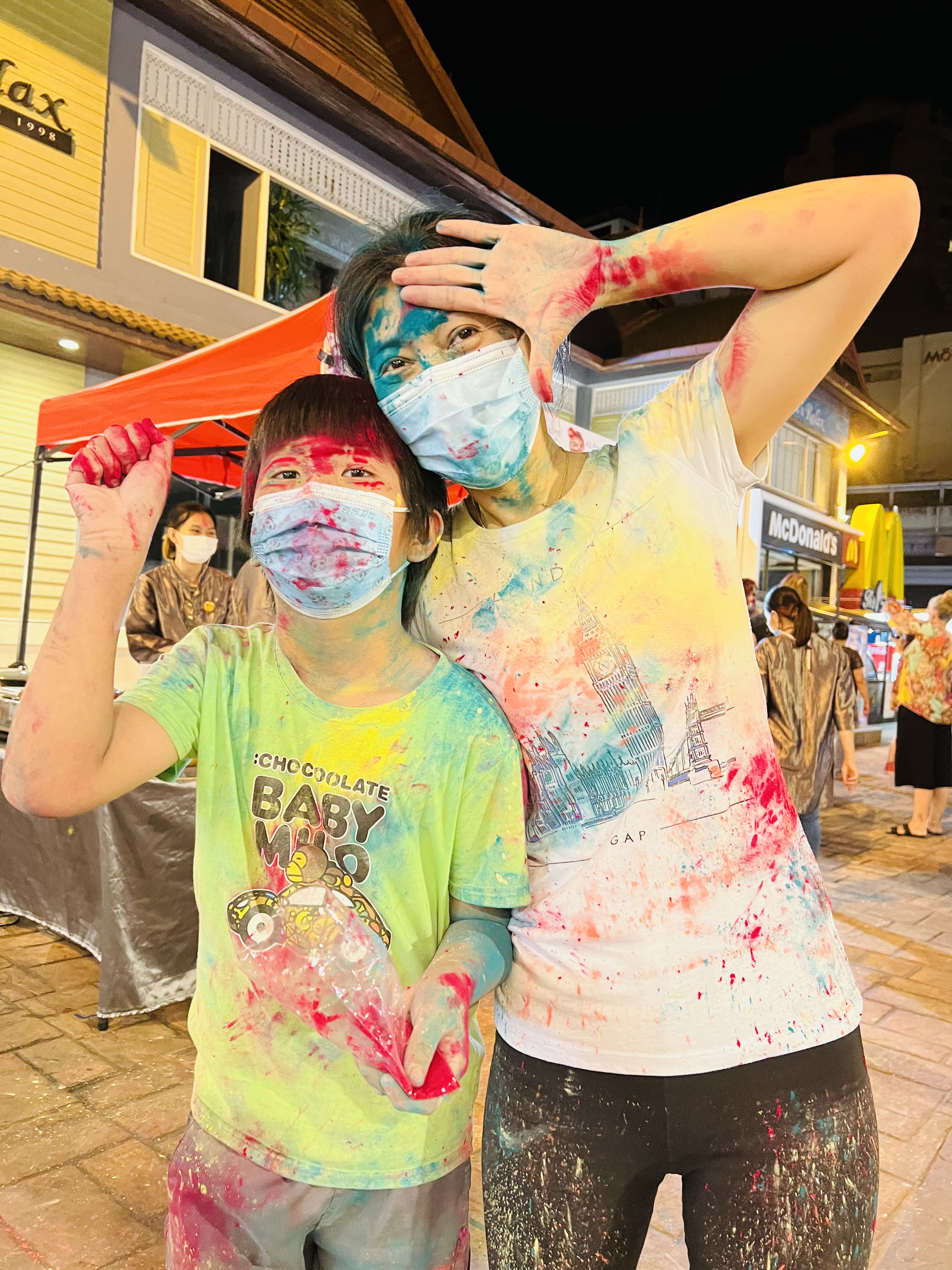 Then finally, the moment everyone had been waiting for arrived. Family, friends, and farangs alike doused each other in dyed powder. Children sprinted around the plaza, tagging each other with colour and tripping over their own excitement. Adults became kids again, making full eye contact with their targets before launching rainbow kill-shots. For one glorious hour, the crowd left behind the worries of yesterday and delighted in the joy of the now.