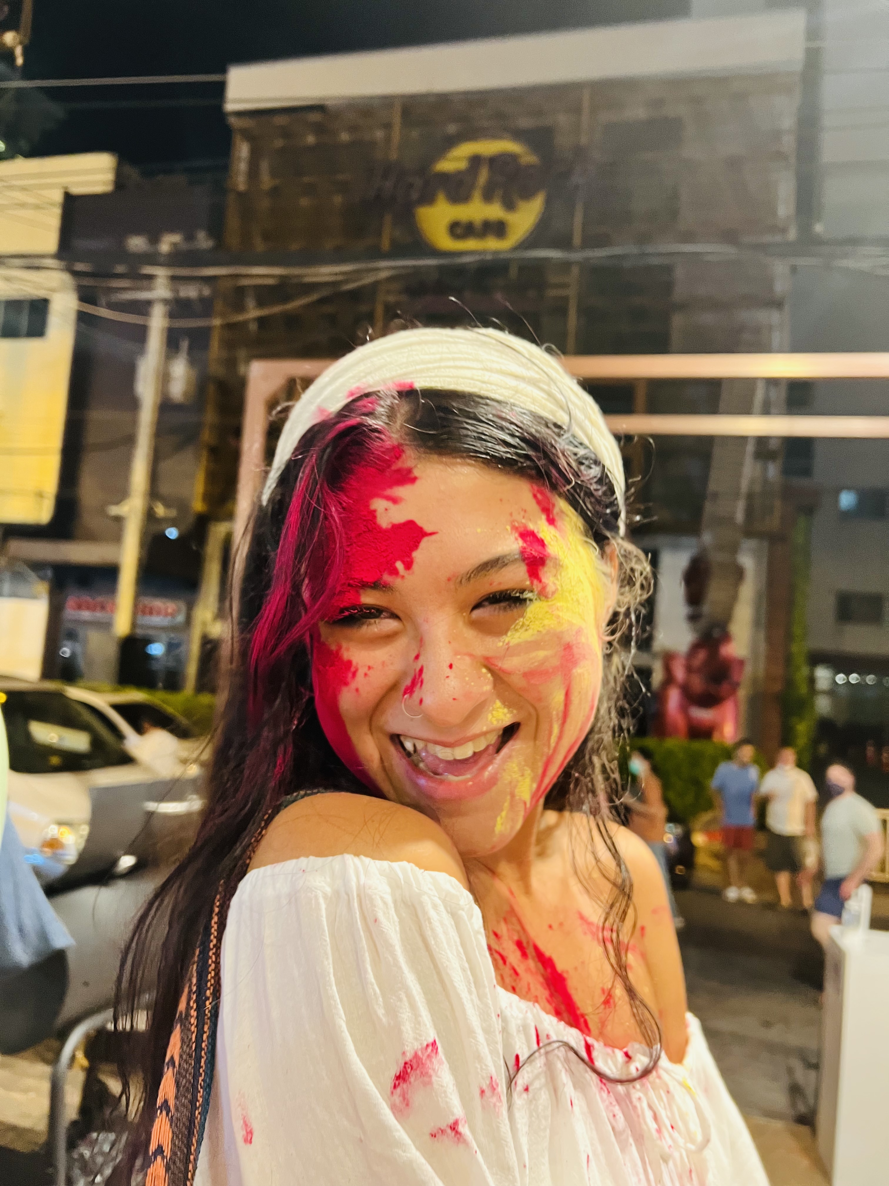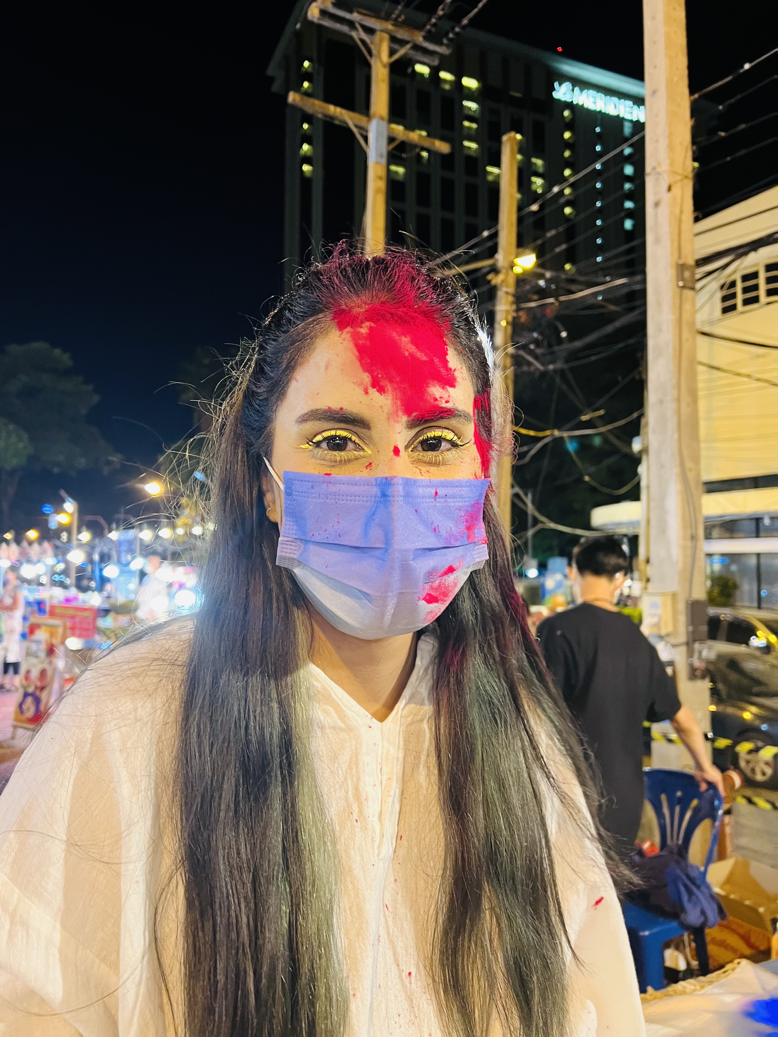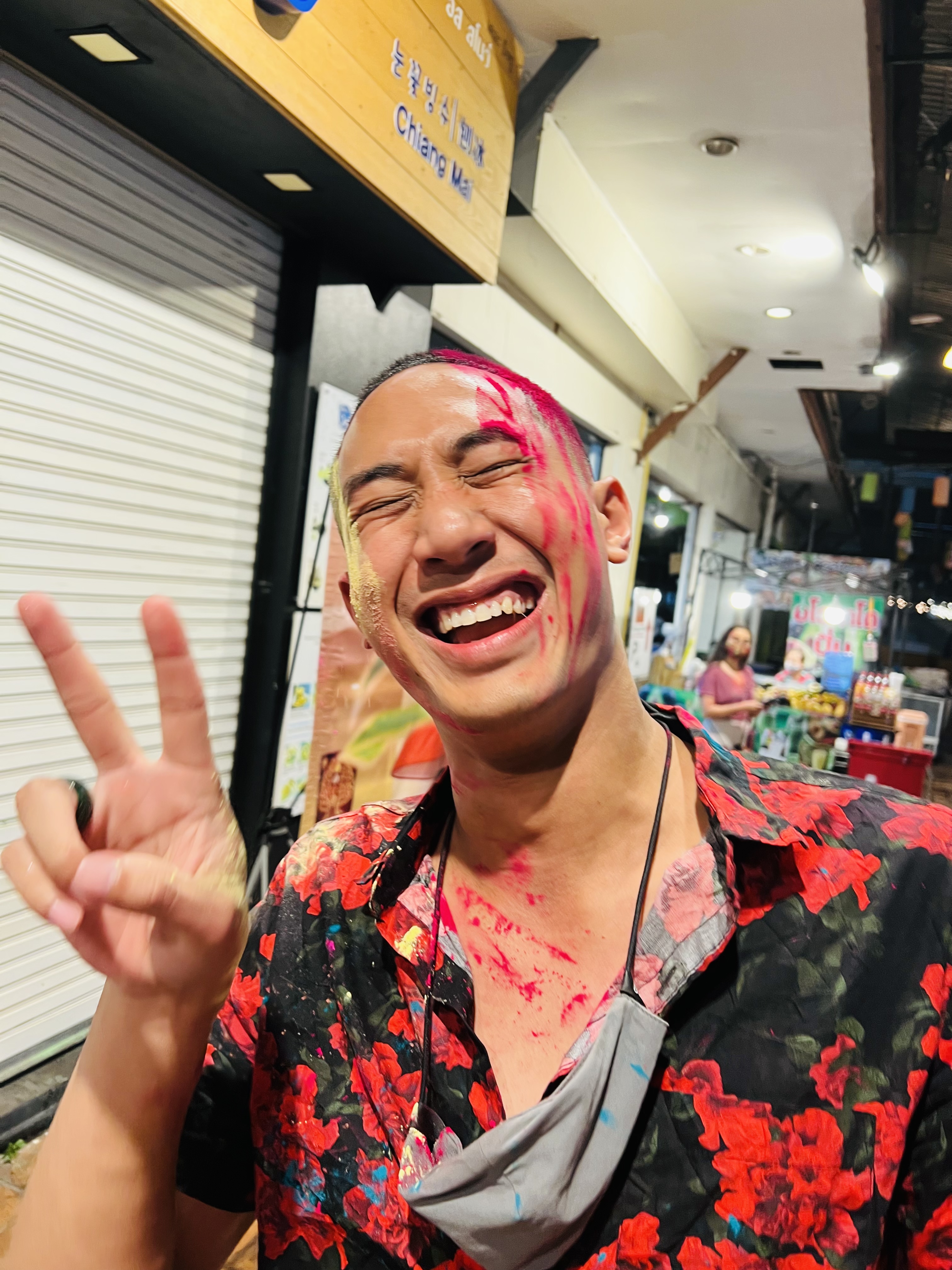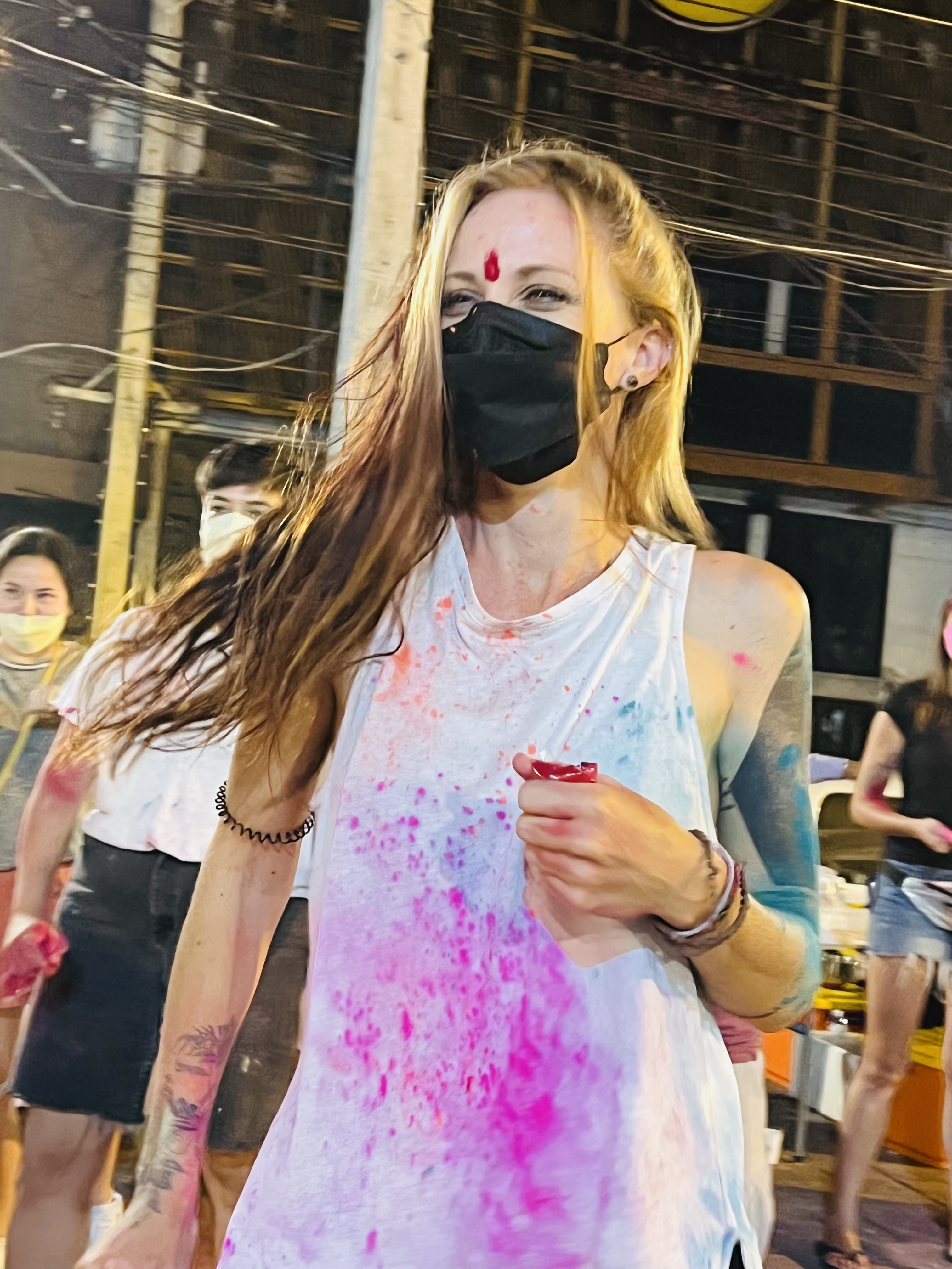 Then finally, the moment everyone had been waiting for arrived. Family, friends, and farangs alike doused each other in dyed powder. Children sprinted around the plaza, tagging each other with colour and tripping over their own excitement. Adults became kids again, making full eye contact with their targets before launching rainbow kill-shots. For one glorious hour, the crowd left behind the worries of yesterday and delighted in the joy of the now.
