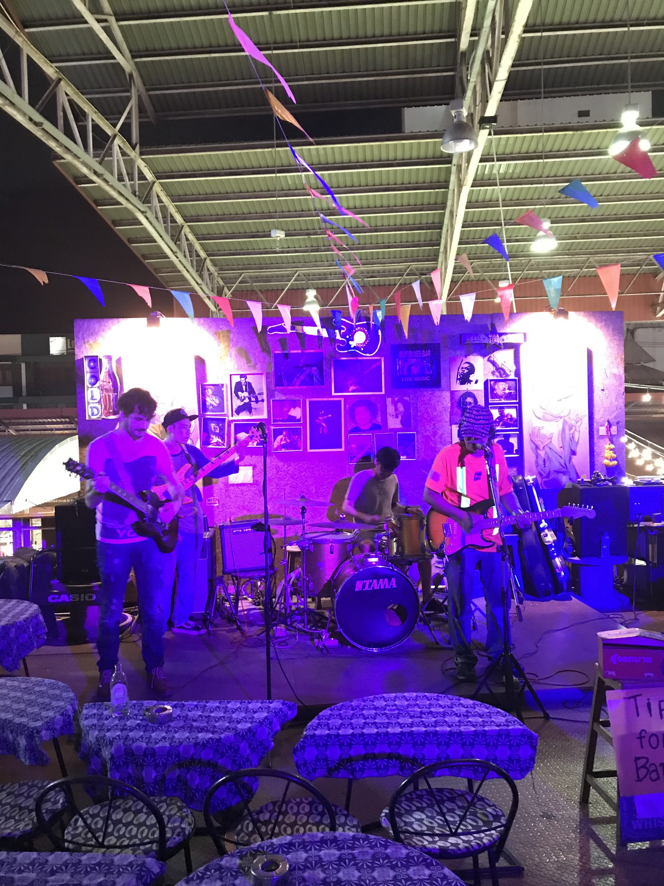 The venue itself is fun and unique. The bar is on an open deck, overlooking parts of the night market. Varying seats and tables surround the center stage. On the sides, next to the deck railings, are comfortable leather seats. There are plenty of places to sit and enjoy the music. In the back is a small bar area, with an abundance of beers and liquors. Boy Blues Bar is outdoors, which is part of what makes it so enjoyable. The artsy stage backboard and moody lighting really add a lot to the venue.