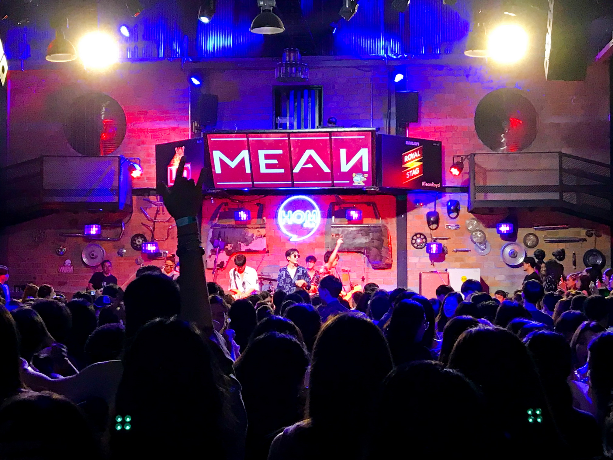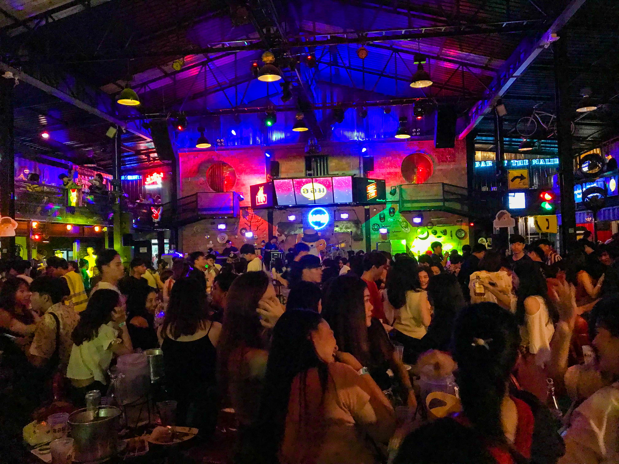 Modern, stylish, and fun, I found Hom Bar to be truly a genuine Thai experience. Before the show, I spent some time exploring the bar and the surrounding area. The main seating area, which is under a large roofed section, is encompassed by a number of restaurants. 15 restaurants in total surround the covered area, offering everything from hamburgers to Thai food. The food and drinks are served A La Carte, and brought to tables inside and outside of the venue. A VIP balcony overlooks the stage, and on the sides, bars serve a wide range of liquor and drinks. Hom Bar is very fresh and new, abounding with character and a fun California-like vibe. It’s a bar I could maybe imagine existing in some liberal town back in the United States, with it’s modern architecture and random decorations, which add a lot, complementing its simple laidback atmosphere. The wall behind the main stage is brick, illuminated by colorful fluorescent mood lighting. A number of random decorations hang on the stage wall, interspersed with purple spotlights, which bathe the audience in an array of bright colorful beams. Neon signs hang on parts of the metal building, their psychedelic colors lighting up dark areas. A number of old street signs and beer logos also adorn the polished wood and brick architecture. There is even an old car hanging from the ceiling in one corner of the venue.