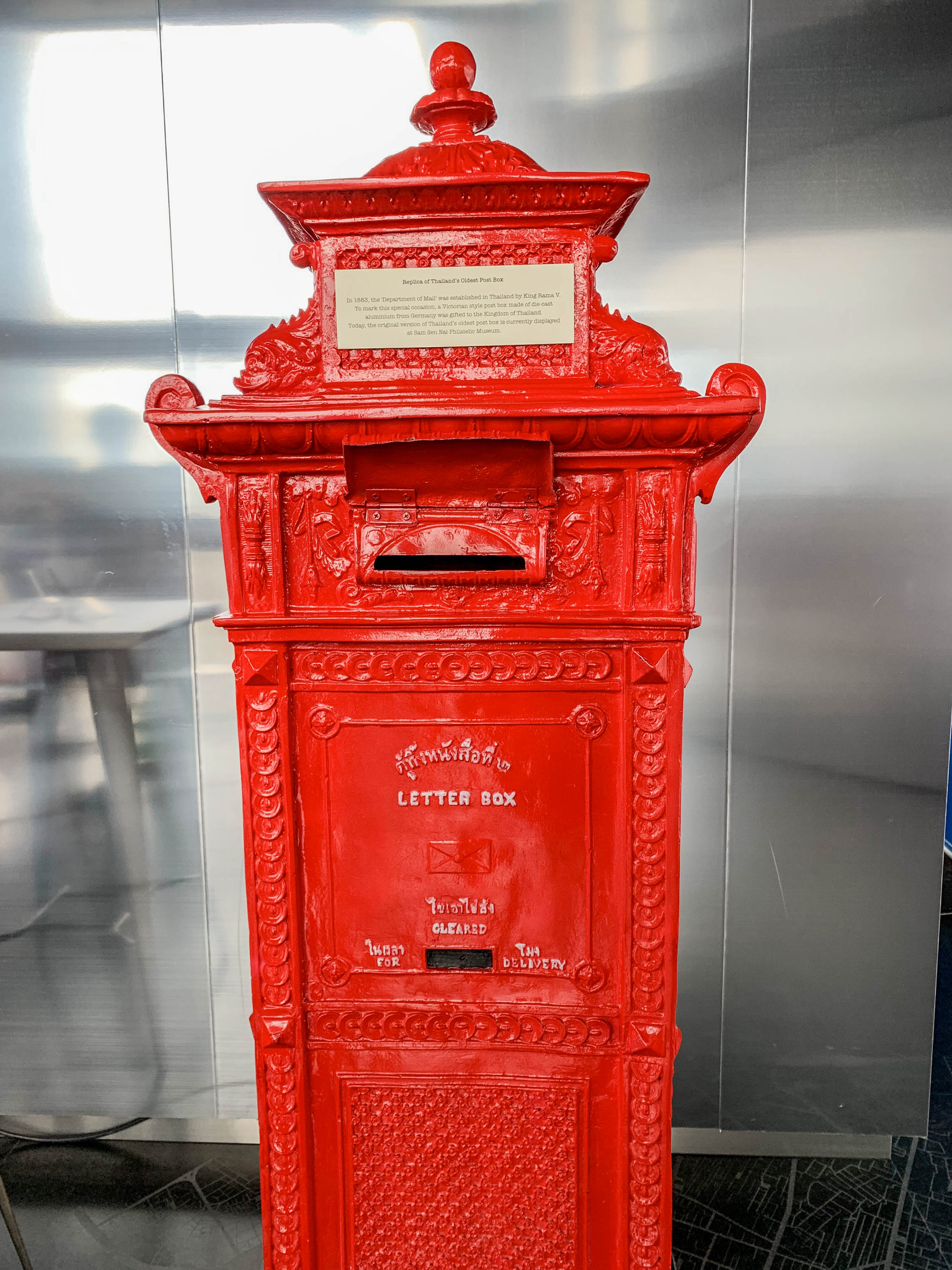 This 360 degree observation hall which wraps around the entire floor feels like a sophisticated art exhibition, Bangkok, the art show featured. You can sit in beanbags and simply stare at the metropolis below, which doesn’t seem to end in any direction, sprawling out like an urban kudzu towards the horizon. There are all sorts of toys to play with such as the interactive screens where you can learn the history of locations you are gazing at, and my favourite, an app you can download for free which allows you to point your phone at any direction and information about that building, or that park, or that river or district will pop up for you to read in multiple languages. There are binoculars which you can use to look down onto rooftops, we were far too high up to look into windows, and a whimsical post box – the highest in Thailand, and functioning, it proudly announces!