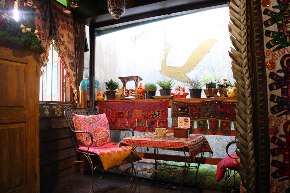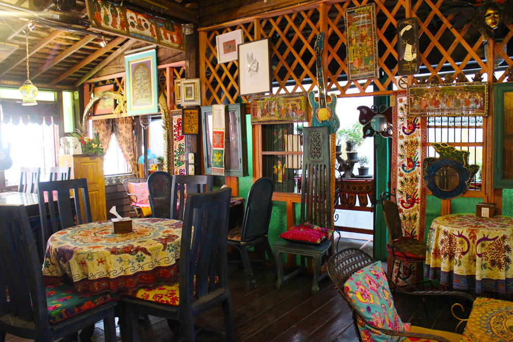 Down the Lao Jow Street (China town) of Warorot, there are all sorts of colourful shops selling a variety of things such as Lanna costumes, plastic flowers, fabric and gold. One particular shop, Nai99 Shop, has been open for many years and is well known for its assortment of funky and kaleidoscopic Nepalese imported items from materials to fashion, accessories to home décor. If you are a regular at Warorot you must have either clocked it as you walked past, or ventured in to spend a few pennies. But if you are really nosy, walk in and there is a tiny little sign advertising a coffee shop. A small steep wooden staircase leads you up the stairs, flanked by Nepalese knickknacks, to an adorable coffee shop. You will feel as though you are sitting in a hippie hangout in Pokhara, surrounded by Himalayan fabrics and art, as you sip coffees, smoothies, teas and take bites of delicious cakes and other goodies. Interestingly, most of the clientele are tourists, with a good mix of backpackers and Chinese.