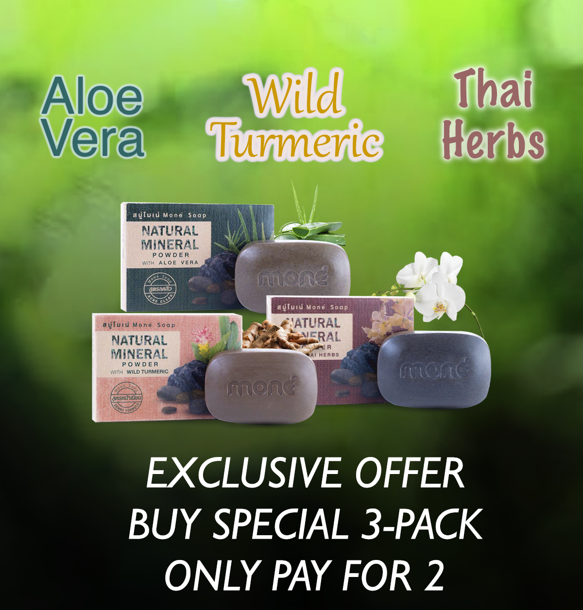 In recognition of Moné being our first featured brand, Khun Onampai is offering Citylife an exclusive special offer. A special 3-pack of Aloe Vera, Turmeric, and Thai Herb mineral soap bars, for the price of 2 bars. So, buy 3 but only pay for 2.
