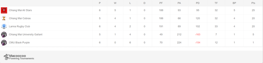 The Purple/Blacks came back strong after the break and got on the scoreboard again with a converted try to cut the deficit to 19-14. That was however as close as they got, as again fatigue kicked in and the All Stars took total control. Chatchanan Piaesupong was outstanding as he added a further three tries to his tally for a personal score of 4 tries. Chaithawat Thepmongkun helped himself to another as the CMU lads imploded, to take his tally to three. Peemchim, Pudis Sangsuwan & Nuttanun Junkeaw all got on the scorecard as the All Stars closed out the game, 60-14. The Purple/Blacks fought hard but the more experienced All Stars shut them down. With a bonus point win the All Stars are now favourites to win the league with two matches to go. A must win game for both the All Stars & CM Cobras on the 28th October. A cobra’s win will put them in the driving seat. An All Stars win would all but hand them the title.