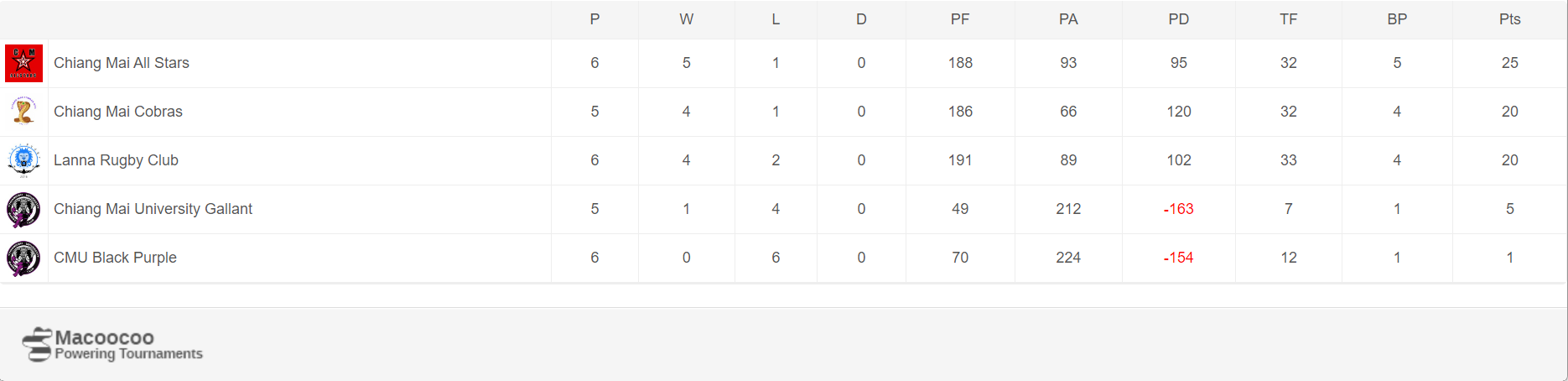 The Purple/Blacks came back strong after the break and got on the scoreboard again with a converted try to cut the deficit to 19-14. That was however as close as they got, as again fatigue kicked in and the All Stars took total control. Chatchanan Piaesupong was outstanding as he added a further three tries to his tally for a personal score of 4 tries. Chaithawat Thepmongkun helped himself to another as the CMU lads imploded, to take his tally to three. Peemchim, Pudis Sangsuwan & Nuttanun Junkeaw all got on the scorecard as the All Stars closed out the game, 60-14. The Purple/Blacks fought hard but the more experienced All Stars shut them down. With a bonus point win the All Stars are now favourites to win the league with two matches to go. A must win game for both the All Stars & CM Cobras on the 28th October. A cobra’s win will put them in the driving seat. An All Stars win would all but hand them the title.