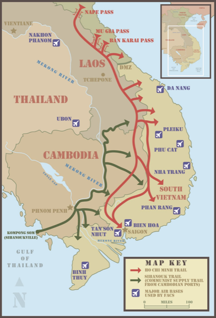 During the Vietnam war, despite being neutral, Laos happened to be located in a very unfortunate but strategic place. For, Laos in the East (along with Eastern Cambodia) contained the Ho Chi Minh trail which was a network of roads and trails for the Vietcong to send supplies, weapons, and troops into South Vietnam. It was the Vietcong’s lifeline, in other words. As a result, the US air force (using Thai airbases in Don Muang, Udon, Korat, Ubon, and U-Tapao) bombed Laos and Cambodia to smithereens.