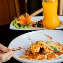 จานต้องห้ามพลาดก็คือเมนูพิซซ่าสไตล์เม็กซิกันที่ผสานรสชาติวัตถุดิบของไทยเราอย่างเนื้อต้มเค็มได้อย่างลงตัว จานต่อมาลิ้มรสจัดจ้านกับลาบปลาแซลมอนสด ที่ครบเครื่องในเรื่องรสชาติ สลัดอกเป็ดย่าง และผัดกระเพราแก้มหมูตุ๋น ก็นับเป็นจานที่ทานง่ายๆ ทว่าอิ่มได้นานๆ ยิ่งไปกว่านั้น ยังมีเซ็ตเมนูอาหารกลางวันสุดคุ้ม 135 บาท ที่ให้เราเลือกจับคู่เมนูโปรดกับเครื่องดื่มได้ตามชอบ
