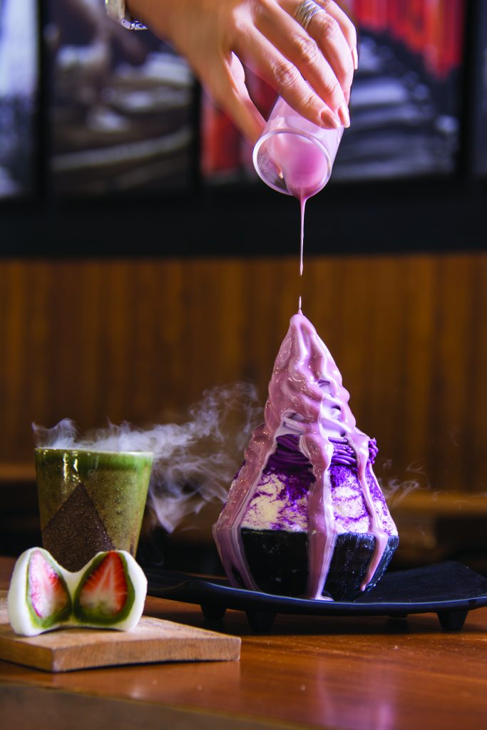 The sweet potato is an under-utilised raw ingredient. But this month The Volcano sweet toast shop and Sofuto shaved ice outlet, both owned by brothers Chana ‘Kong’ Punyapinyophol and Nutthawut ‘Keng’ Punyapinyopho, invite us to fall in love with this starchy beautiful tuberous root. The brothers have imported these special vibrant purple sweet potatoes, of the ‘purple sweet road’ variety, from Japan and have been experimenting with how to use them. Today they are ready to launch the fruits of their experimentation and you can stop by Sotufu to try their vibrant purple sweet potato shaved ice (murasaki kakigori) which goes wonderfully with The Volcano’s pocket purple sweet potato cheese toast.
