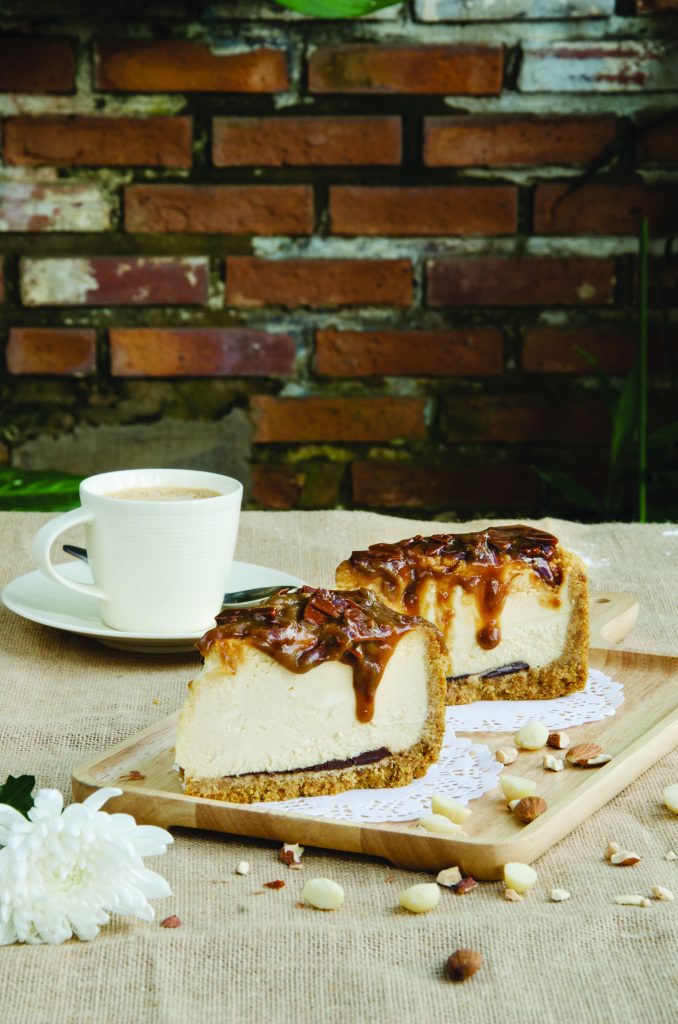 - นำครีมครีมคาราเมลที่ได้ไปปาดบนหน้าชีสเค้กที่อบเสร็จเรียบร้อยแล้ว จากนั้นพักไว้เพื่อรอการตกแต่งด้วยบัตเตอร์ท็อฟฟี่