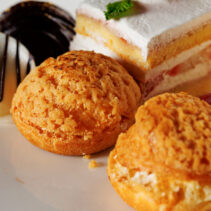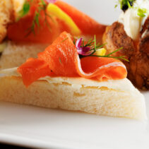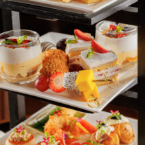 บรรดาเซ็ตของว่างคาว-หวาน ที่จัดเรียงมาบนชั้นให้ทานคู่กับชาถ้วยโปรด มีทั้งกุ้งพันหมี่ทอดกรอบ กุ้งทอดเนื้อแน่นเด้ง พันด้วยหมี่กรอบเพิ่มรสสัมผัส ฉ่ำด้วยซอสสูตรเด็ด, พายไก่ฝรั่งเศส แป้งพัฟเบาบางกรอบลูกกลมๆ กลิ่นหอมเนย ที่ข้างในสอดไส้แน่นๆ ด้วยไก่เนื้อนุ่ม, อร่อยเต็มคำกับ มันฝรั่งอบ ก้อนกลมไซส์มินิ เพิ่มรสสัมผัสความกรุบด้วยคาเวียร์ที่ท็อปอยู่ด้านบน, หอมอวลกับแซนด์วิชแซลมอนครีมชีส แซลมอนรมควันผสานความหอมมันของครีมชีส เสิร์ฟมาบนขนมปังแซนด์วิช, ชูครีมกรอบนอกนุ่มใน ก้อนพอดีคำที่ด้านในอัดแน่นไปด้วยชีส รสชาติหวานมันกลมกล่อม