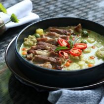 เมนูสุดคลาสสิคอย่างแกงมัสมั่น ได้ถูกนำเสนอในรูปแบบใหม่หรือไทยทวิสต์ เป็นมัสมั่นน่องเป็ด ที่ตุ๋นในน้ำมัน ในรูปแบบกงฟี ทำให้ได้เนื้อเป็ดที่นุ่มก่อนนำมาทอดกรอบ แล้วราดด้วยน้ำแกงมัสมั่น เพิ่มรสสัมผัสความอร่อยด้วยมันบดชุบแป้งทอด เป็นเมนูที่นำมาทวิสต์กันได้อย่างลงตัว
