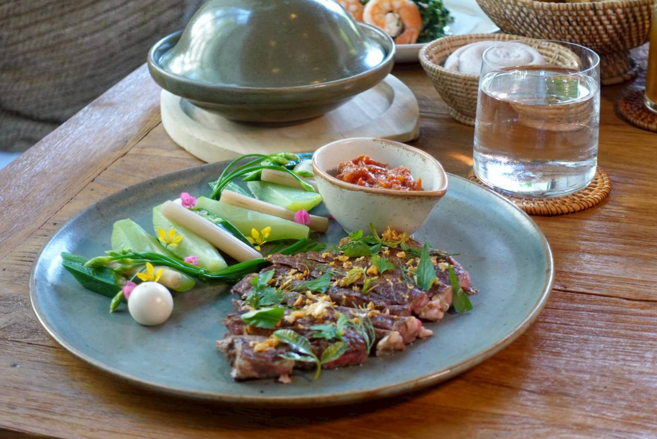 สำหรับเมนู Childhood Heritage มีทั้ง เนื้อย่างน้ำพริกล่าหู่ เป็นเมนูน้ำพริกสูตรเด็ดชาวล่าหู่ ที่ต่อยอดไอเดียจากหนึ่งในทีมงานที่มาจากชนเผ่าล่าหู่ ทำจากมะเขือเทศที่โขลกกับพริก หอมแดง ก่อนนำมาปรุงรสเป็นน้ำพริกที่อร่อยครบรส เป็นเครื่องจิ้มที่เข้ากันดีกับเนื้อริบอายย่างให้รสชาติที่กลมกล่อม เคียงมากับพืชผักในท้องถิ่น อย่างผักฟักแม้ว ดอกกระชาย มะเขือไข่เต่า ไหลบัว และกระเจี๊ยบ