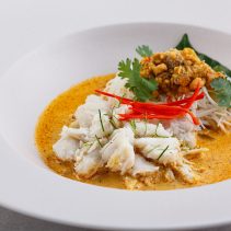 ยังมีจานจากวัตถุดิบที่คัดสรรมาอย่างดี อย่างยำปลากุเลาเค็มกับปลาหมึกกะตอย ที่เลือกใช้ปลากุเลาเนื้อหอมหวาน ส่งตรงจากจังหวัดประจวบฯ และปลาหมึกกะตอย จากแหล่งแพปลาที่จับปลาหมึกเพื่อนำมาทำปลาหมึกแห้งโดยเฉพาะ ทำให้ได้ปลาหมึกรสชาติหวาน ทานอร่อย และที่เชฟยกให้เป็นจานดีทีเด็ด ก็คือแกงปูภูเก็ต ของดีแห่งปักษ์ใต้ ที่เพิ่มความพิเศษขึ้นปอีกด้วยไข่ปูที่ท็อปไว้ด้านบน