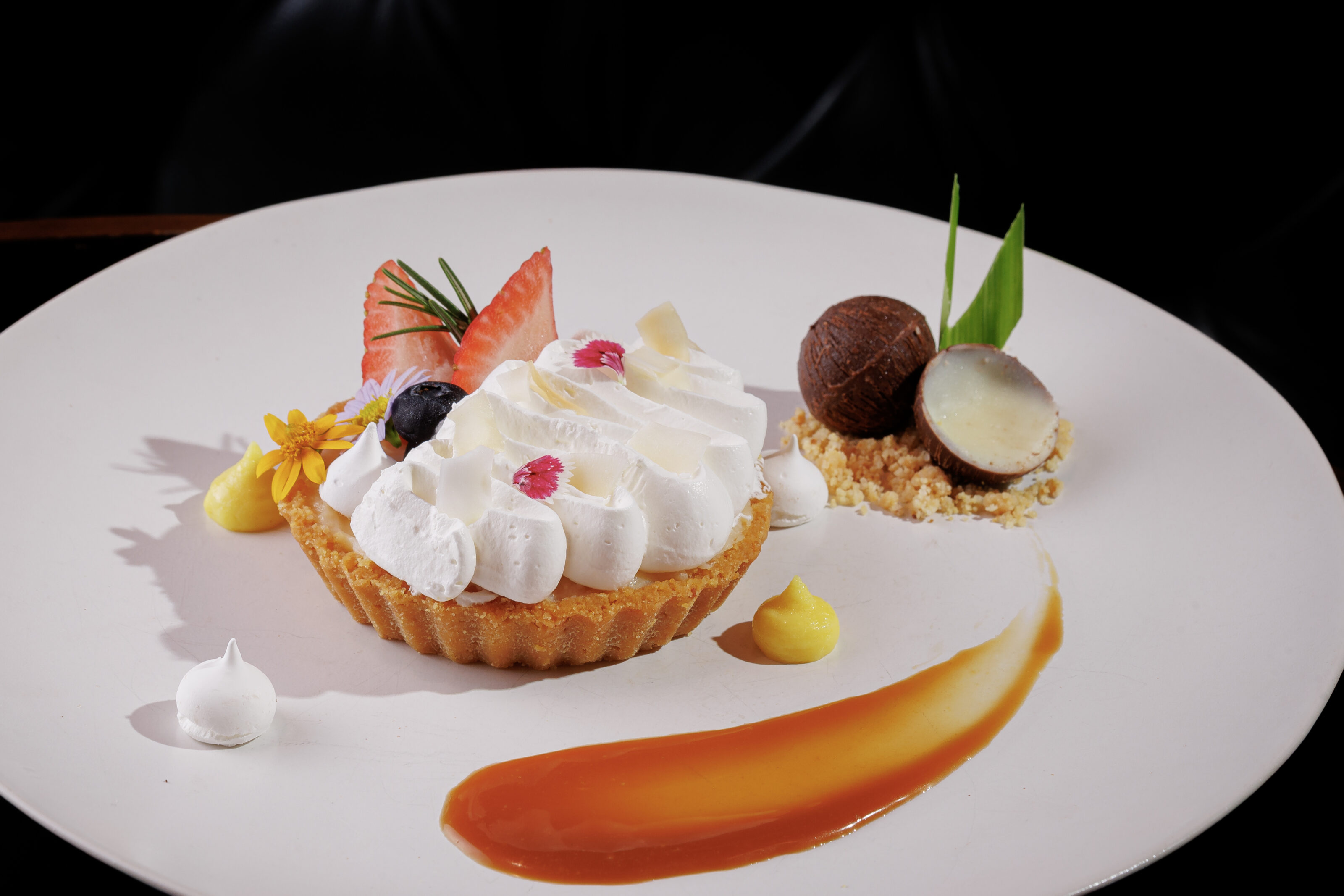 ปิดท้ายคอร์สด้วยความหวานละมุนจาก พายมะพร้าวอ่อนหอมนุ่มท็อปด้วยวิปปิ้งครีมเนื้อนุ่มฟู ทานอร่อยกับช็อกโกแลตลูกกลม ครัมเบิ้ล และซอสคาราเมล ที่เสิร์ฟเคียงมาในจาน ชื่นใจปิดท้ายคอร์สอย่างสมบูรณ์แบบ