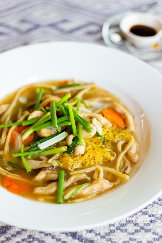 “The next part, which took me a while to get right was the noodles. I finally figured out that the best way was to boil the noodles before frying them in really hot oil. This makes the dish a bright yellow colour, and gives the noodle a nice crispy consistency. As to the sauce, I used to be frustrated as every time the sauce cooled, it would thin. So I tried using potato flour and now the sauce stays at the same consistency at any heat. And it’s important to always sprinkle fresh spring onion on top before serving.”