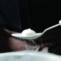 ของหวานอันน่าตื่นตาตื่นใจก่อนเข้าสู่อาหารจานถัดไป โดยใช้เทคนิคของโมเลกูลาร์ที่มีส่วนผสมของไนโตรเจนเหลวมาผสมผสานกับโฟมผลไม้ฝรั่ง เสิร์ฟบนช้อนดีไซน์เก๋ เมื่อทานเข้าไปแล้วจะให้ความรู้สึกเย็นสดชื่น อีกทั้งยังมีไอควันจากไนโตรเจนที่สามารถคลายพ่นออกทางจมูกและปาก ซึ่งเป็นอีกเมนูที่ให้ความสนุกเพลิดเพลินกับผู้ทานได้อย่างดี