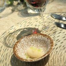 ไปกันต่อกับคอนเซ็ปต์ Degustation Menu จานนี้ที่เชฟนิยามว่ามี 3 มิติในรสชาติ โดยการรวมเอาวัตถุดิบ 3 อย่างมารวมไว้ในจานเดียว ทั้งฟัวกราส์หรือตับห่านย่างเสิร์ฟมาบนขนมปังบริยอชย่าง, มะม่วงโชคอนันต์และฟ้าลั่นที่เสิร์ฟในรูปแบบชัทนี่คล้ายกับแยม รสเปรี้ยวหวานกำลังดี เพิ่มความบาลานซ์ให้กับรสชาติด้วยกระเทียมดำ ทานคู่กับซุปกระดูกผสมผสานกับวอดก้าเลมอนเนด