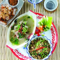 จากนั้นเลือกมุมที่นั่งได้ทั้งบนเรือนไม้ยกสูง หรือเอนกายบนเบาะ ฟังเสียงธารน้ำที่ไหลเอื่อยๆจากยอดเขา แล้วมาเริ่มต้นด้วยเมนูของคาวสไตล์ล้านนาอย่าง หมูทอดน้ำพริกข่า ลิ้มลองน้ำพริกข่า เมนูพิเศษที่ร้านคิดขึ้นมาเอง รสชาติเป็นเอกลักษณ์ไม่เหมือนใคร ต่อด้วย ต้มซี่โครงหมู กับรสชาติเผ็ดจัดจ้านถึงใจ และ ลาบหมูคั่ว ที่เน้นหนักสมุนไพรและเครื่องเทศทำให้มีกลิ่นหอมเป็นพิเศษ เสิร์ฟพร้อมกับผักสดอย่าง แครอท ถั่วฝักยาว และ แตงกวาหั่น ทานคู่กับข้าวเหนียวร้อนๆ จากกระติบจักรสาน ตบท้ายด้วยของหวานอย่างบราวนี่อัลมอนด์ บราวนี่ชาเขียว และบลูเบอรี่ชีสพาย เนื้อแน่นและรสชาติกลมกล่อม มาพร้อมกับครื่องดื่มซิกเนเจอร์สุดเข้มข้นของร้านอย่างกาแฟหลองข้าว เรียกได้ว่าสุขทั้งบรรยากาศ สุขทั้งมื้ออาหารกันเลยทีเดียว