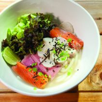 Pongpeera ‘Boy’ Bulyalert serves you organic food in a modern industrial grunge venue in the heart of the city. A lover of all things healthy and tasty, Ball’s recommended dishes include the beer battered herb chicken wings, crab cream cheese spring rolls, cold tofu salad and the hakata wagyu pad krapao. Their intriguingly named salmon in spicy blue lagoon uses the anchan flower (butterfly pea) as a soup base, making for an intriguing coloured soup. There is also a small Japanese menu of Japanese eggplant, udon and sashimi.