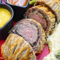 Beef Wellington: เนื้อสันในเกรดพรีเมี่ยม ห่อด้วยเชอราโนแฮม, truffle paste และแป้ง pastry ข้าวก่ำ