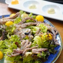ปลาหมึกยักษ์จิ๋วย่าง ปลาหมึกเนื้อสดเด้ง เคี้ยวกรุบ เพิ่มรสชาติความอร่อยด้วยการหมักสมุนไพรก่อนนำมาย่าง เสิร์ฟพร้อมมันฝรั่งนึ่ง หญ้าฝรั่น ผักสลัด และมะเขือเทศราชินี เป็นจานที่เรียกน้ำย่อยได้เป็นอย่างดีก่อนที่จะทานจานหลัก