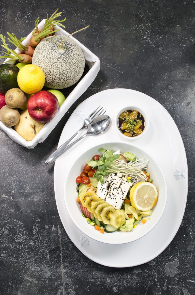 - นำผักสลัดออร์แกนิคชนิดต่างๆ และผลไม้ตามฤดูกาลที่ชื่นชอบใส่ลงไปในถ้วยเสิร์ฟ พร้อมจัดตกแต่งให้สวยงาม