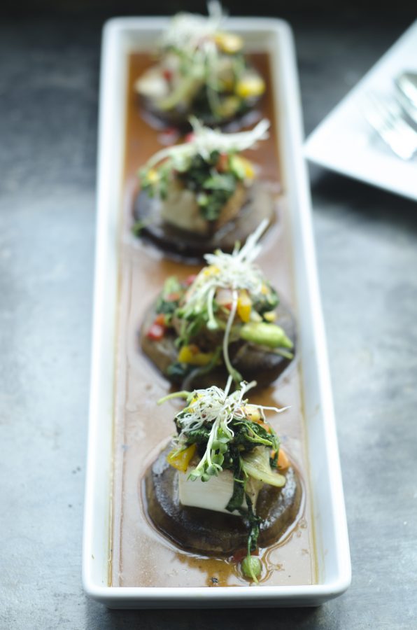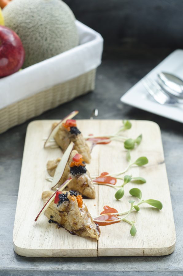 Cold tofu sits on a bed of organic seasonal salads and fruits such as grilled lemons, avocado, orange wedges, kiwi fruit, corn, carrots, tomatoes, pumpkin shoots, dragon fruit, red and green apples, cucumber, and whatever ingredient is freshest and healthiest at the time. The salad dressing is made from seasonal fruits marinated in ponzu sauce for seven days, and the entire dish is guaranteed to be super fresh and healthy. Other intriguing dishes from Chef Boy include sweet tofu stuffed with raw fish and stir fried Japanese eggplant with basil sauce.