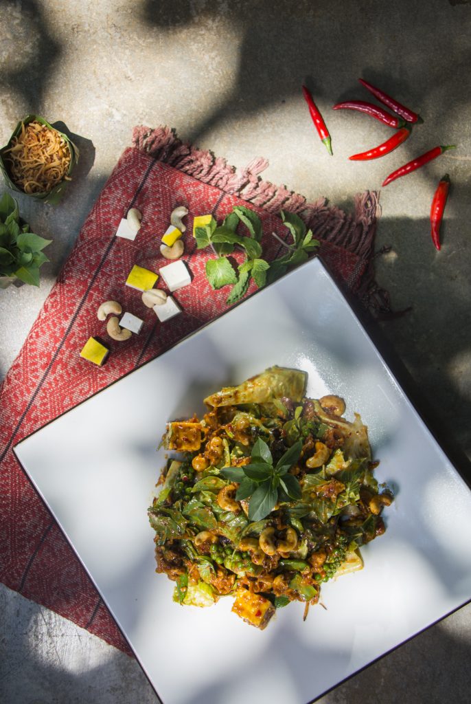 During the hot season, it’s best to keep your diet light, fresh and healthy. Fahtara herb garden salad is packed with a variety of mixed greens and fresh herbs and served with a tangy tamarind coconut dressing. The tangy taste paired with sweet and spicy accents is a perfect complement for the fresh green leaves. Cashew nuts, crush peanuts and roasted coconut is sprinkled on top to add a crunchy level to this easy but complex dish. You can go full veggie and have it with tofu or add some protein and add a side of freshly cooked shrimp instead.