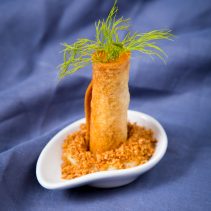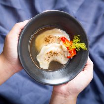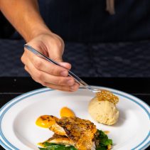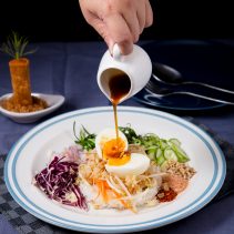 เริ่มต้นด้วยเมนูต้อนรับเป็น ฟรูริปูริ ซึ่งเป็นแป้งโรตีกรอบสอดไส้ มันฝรั่ง แครอท ไข่ มะม่วง และ พริก จัดเสิร์ฟคล้ายรูปทรงของต้นมะพร้าว เป็นเมนูพิเศษที่สะท้อนถึงวัยเยาว์ของเชฟภูริ ถัดมาเป็น ข้าวยำสมุนไพรกับน้ำบูดู หรือ ข้าวยำปักษ์ใต้โบราณ อุดมด้วยพืชผักและสมุนไพรนานาชนิด คลุกเคล้ากับน้ำสลัดรสกลมกล่อม อีกหนึ่งเมนูจานหลักคือ สเต็กปลากระพงซอสครีมมะนาว เนื้อปลาย่างกลิ่นหอม รับประทานคู่กับผักเหลียง ซึ่งเป็นผักสมุนไพรพื้นบ้านของชาวใต้ มีคุณค่าสารอาหาร เสิร์ฟพร้อมกับมันบดและซอสฟักทองสีเหลืองส้ม ปิดท้ายมื้อด้วย ช็อคโกแลตมูส หรือ มูสเนื้อนุ่มลิ้นโรยหน้าด้วยธัญพืชและขนมกรุงกรอบ