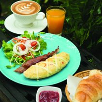 มองหามุมอันเงียบสงบและเป็นส่วนตัวในโซนนั่งสบายๆ ที่ตกแต่งด้วยเฟอร์นิเจอร์สีสันสดใส หรือโซนห้องปรับอากาศ แล้วมาเริ่มต้นกับจานแรกเป็นชุดอาหารเข้าสไตล์ตะวันตกแบบ All Day Breakfast ประกอบไปด้วยไข่ แฮม เบค่อน และขนมปังทาแยมสูตรโฮมเมด รับประทานคู่กับเครื่องดื่มเป็นกาแฟ หรือน้ำส้มคั้นสด หรือใครที่ชื่นชอบเมนูเพื่อสุขภาพ โปรดอย่าพลาด ทูน่าสลัด เสิร์ฟพร้อมกับน้ำสลัดรสจัดจ้าน หรือจะเลือกเป็น กรีกสลัด สำหรับผู้ที่เป็นมังสวิรัติ ต่อด้วยเมนูเส้นสุดอร่อยอย่าง สปาเก็ตตี้ผัดเบค่อน และ ก๋วยเตี๋ยวสุโขทัยสูตรต้นตำรับ
