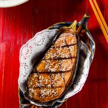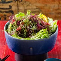 เริ่มต้นด้วยเมนูเรียกน้ำย่อยเป็น มะเขือม่วงราดซอส หนึ่งในอาหารจานร้อนโบราณของชาวญี่ปุ่น ซึ่งมีมานานกว่า 150 ปี เนื้อมะเขือม่วงชุ่มฉ่ำ ทาด้วยซอสมิโซะและโรยหน้าด้วยงาขาว ต่อด้วยเมนูเพื่อสุขภาพอย่าง สลัดสาหร่ายทะเลสด 3 สี ประกอบด้วยสาหร่ายสดจากทะเลญี่ปุ่น เสิร์ฟพร้อมกับผักสลัดและน้ำสลัดงาขาวผสมมิโสะ