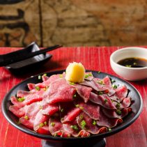 ทากิ ซึ่งอาหารดั้งเดิมของจานนี้ปรุงด้วยเนื้อม้า และเทนโกกุได้นำมาปรับเปลี่ยนเป็นเนื้อวัวส่วนเชอร์รอยด์ชั้นดี นำเข้าจากประเทศออสเตรเลีย รับประทานคู่กับกระเทียมขูดและน้ำซอสพอนสึสูตรพิเศษที่มีส่วนผสมของน้ำมะนาว