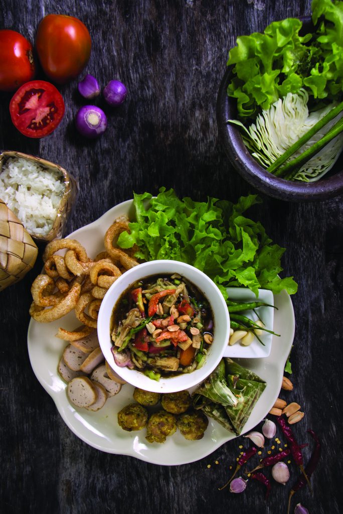 Tum muang muang was created by Rachaneekorn Chirakul the owner of the popular Somtum House who was inspired by the Lanna bamboo shoot salad. Using bamboo shoots, cucumbers and the pungent flavours of pickled crab sauce, these Lanna flavours are pounded together and served in a mortar alongside little dishes such as pork rind, pork sausage, fermented pork and northern sausage.