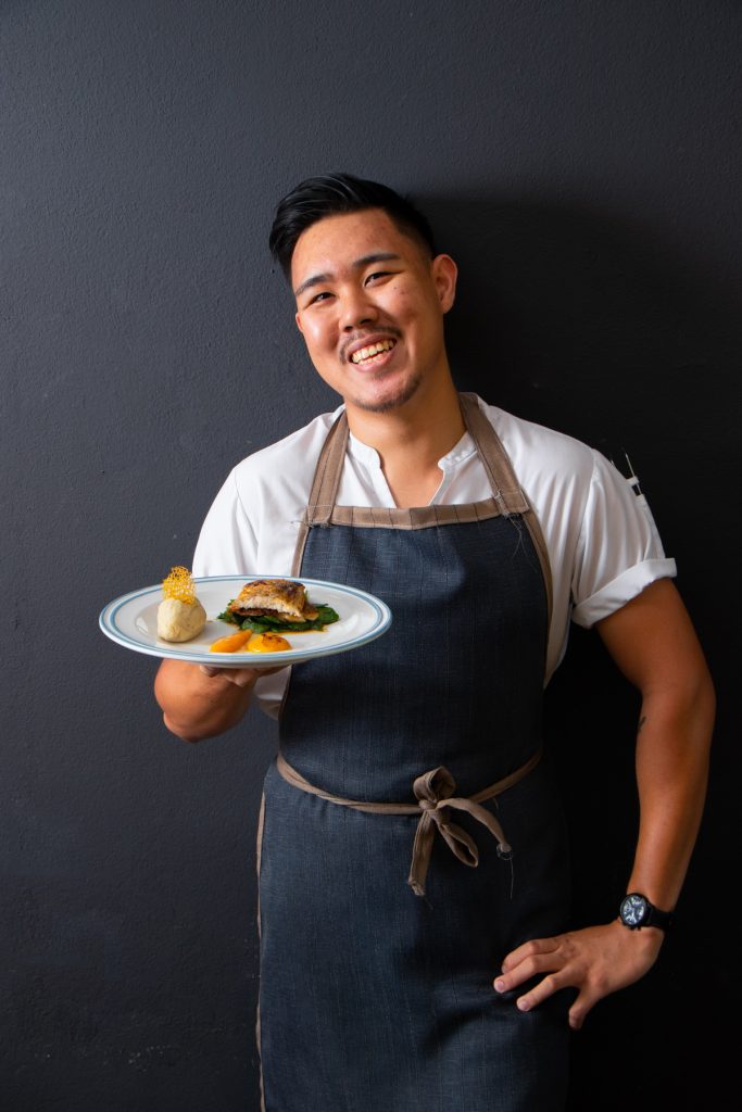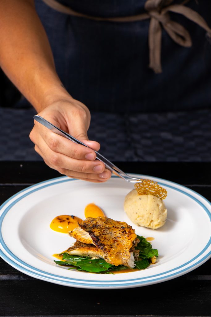 “เมนูแนะนำวันนี้ คือ สเต็กปลากระพงซอสครีมมะนาว จุดเด่นของเมนูจานดังกล่าว ผมได้ใช้ผักเหลียงมาเป็นเครื่องเคียงคู่กับปลากระพงย่าง ซึ่งเป็นผักสมุนไพรพื้นบ้านของชาวใต้ นิยมนำมาผัดกับไข่รับประทานกัน เพราะให้รสชาติอร่อยและยังมีคุณค่าสารอาหารครบถ้วนต่อร่างกาย เสิร์ฟพร้อมกับมันบดและซอสฟักทองสีเหลืองส้ม”