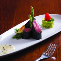 Start with the seared yellow tuna rolls wrapped in nori and filled with avocado, tomato and wasabi mayo for starters, a seafood chowder for soup. The main dish comes out a beautiful colour with the rich browns and soft pinks of the grilled Australian lamb rack served with garlic mashed potatoes and rose gravy. Finish up with the sweet tastes of a warm chocolate lava cake served with vanilla ice cream.