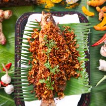 ปลากะพงทอดขมิ้น: ปลากะพงจากแหล่งน้ำธรรมชาติของท้องถิ่นไทย มีน้ำหนักถึง 8 ขีด เนื้อแน่นและสดสะอาด นำมาทอดกับสมุนไพรขมิ้นจนได้สีเหลืองทองและกลิ่นหอม เสิร์ฟคู่กับน้ำจิ้มซีฟู้ดรสเด็ด
