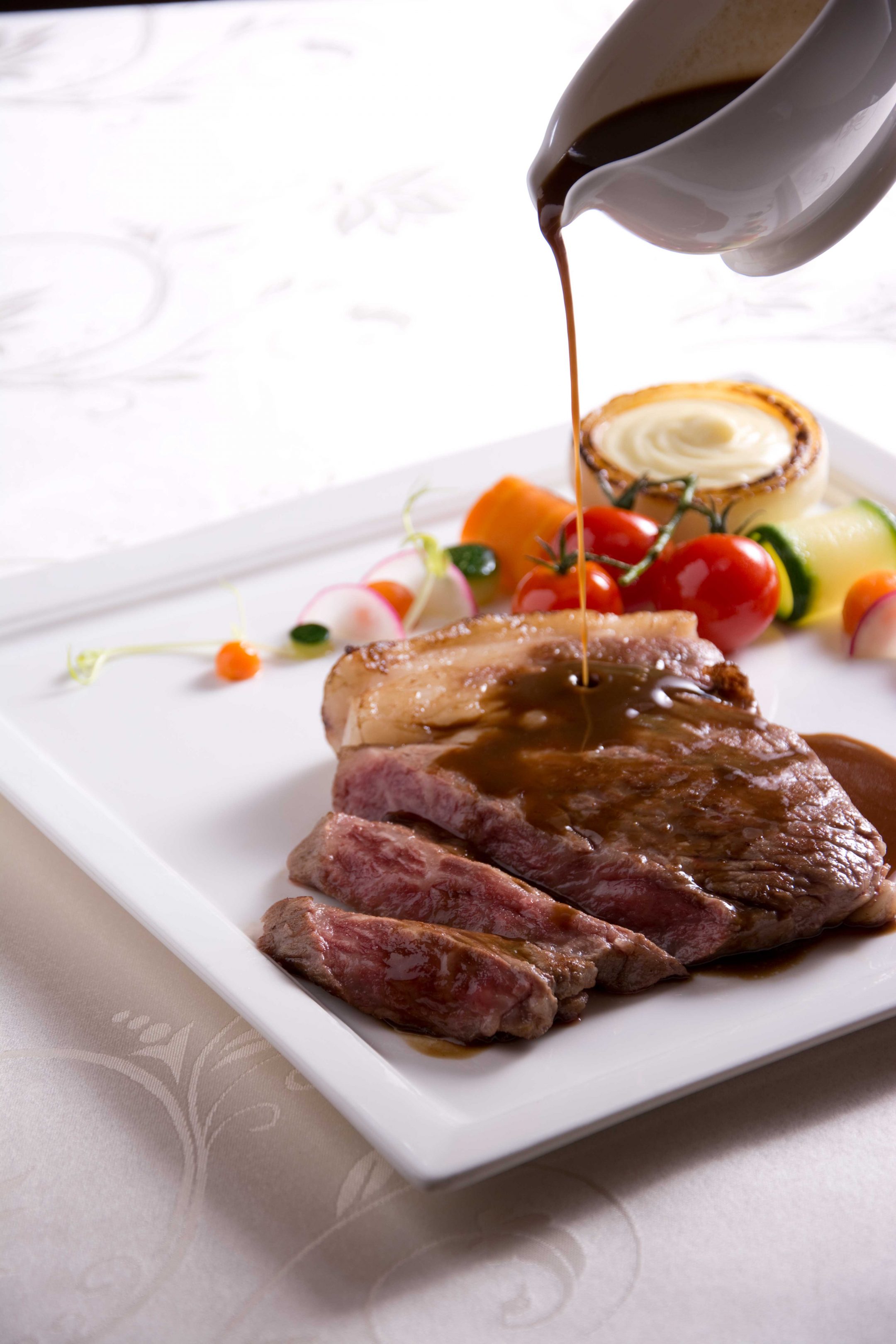 เสาะหาโต๊ะที่นั่งแล้วเริ่มต้นกับมื้อค่ำเนื้อสเต็กสุดพิเศษจานแรก Japanese hida beef strip loin เนื้อฮิดะนำเข้าจากญี่ปุ่น คุณภาพเทียบเท่ากับเนื้อโกเบและเนื้อมัตซึซะกะ ก่อนย่างเนื้อ เชฟจะนำเนื้อฮิดะขนาด 300 กรัมมาพักไว้ในอุณหภูมิของห้อง เพื่อรักษาความฉ่ำของเนื้อให้คงอยู่ตลอดการปรุงอาหารจนเสิร์ฟถึงโต๊ะ รับประทานพร้อมกับเครื่องเคียงที่แขกสามารถเลือกเองได้ อาทิ มันบดอบ เฟรนช์ฟรายส์ สลัดผักสด หรือผักย่าง ตลอดจนถึงมีซอสหลากหลายให้เลือกอย่าง เรดไวน์เกรวี่ พริกไทดำ ทรัฟเฟิล ซอสเห็ด และอื่นๆอีกมากมาย