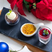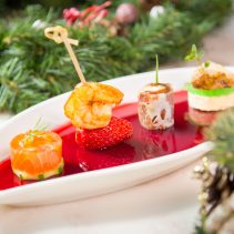 เข้าสู่จานเรียกน้ำย่อยแสนอร่อย ซึ่งประกอบไปด้วยอาหารแบบ one bite จำนวน 4 รายการ วางเรียงกันบนเจลลี่สีแดงรสหวานหอม เช่น (1) ฟัวกราส์มูส เสิร์ฟคู่กับเจอลลี่รูห์บาร์บ (2) อินทผาลัมสอดไส้ชีสนมแพะกับอัลมอนด์ พันด้วยพาร์มาแฮม (3) แซลมอนหมักปรุงรสกับไข่ปลาแซลมอน และ (4) กุ้งย่างบรั่นดีกับสตรอว์เบอร์รี่ซัลซ่าจากโครงการหลวง