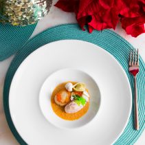 ถัดมาเป็น หอยนางรมคาเวียร์ในซอสแชมเปญซาบายน หอมกลิ่นชีสและรสชาติกลมกล่อม ตามด้วยเมนูกุ้งที่ปรุงด้วยกรรมวิธีซับซ้อนในจานที่เรียกว่า เนื้อปู หอยเชลล์ กุ้งขาวแปซิฟิกคัสตาร์ด เสิร์ฟคู่กับซุปกุ้งแม่น้ำหอมกลิ่นตะไคร้