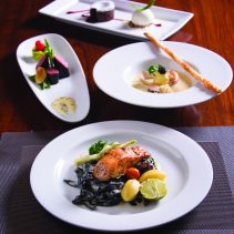 หากใครชื่นชอบสเต็กเนื้อปลา โปรดอย่าพลาดชุดสเต็กปลาแซลมอน ที่มีเมนูจานหลักเป็นเนื้อปลาแซลมอนนำเข้าจากประเทศนอร์เวย์ ทอดเนื้อปลาด้วยน้ำมันน้อยๆตามกรรมวิธีแบบเซียร์ จัดเสิร์ฟพร้อมกับเส้นพาสต้าหมึกดำ และผักโขมที่ผัดผสมกับวาซาบิครีม แต่ก่อนจะเข้าสู่จานหลัก มาเปิดมื้ออาหารสุดพิเศษนี้ด้วยเมนูเรียกน้ำย่อยเป็นคาลิปโซ่สลัดกุ้ง เสิร์ฟพร้อมกับซัลซ่าอโวคาโดและมะเขือเทศ ต่อด้วยเมนูซุปทะเลไวน์ขาวสไตล์เมดิเตอร์เรเนียนกับหญ้าฝรั่ง รับประทานคู่กับขนมปังชีส ปิดท้ายของหวานด้วยคาราเมลคัสตาร์ดเนื้อนุ่มเนียนกับผลไม้สดตามฤดูกาล
