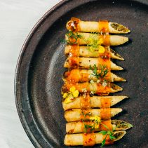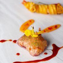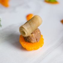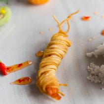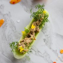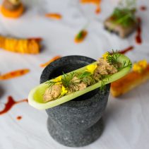 น้ำพริกปลาทู: อาหารไทยจากแดนอีสานที่นิยมเรียกว่า ‘ป่นปลาทู’ นิยมรับประทานคู่กับผักสด จึงนำน้ำพริกปลาทูมาเสิร์ฟในแตงกวาที่ผ่านการแกะสลักคล้ายทรงเรือ ทำให้สามารถรัับประทานได้เป็นชิ้นพอดีทันที