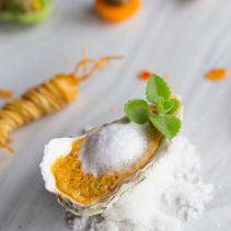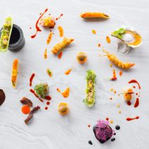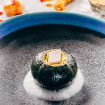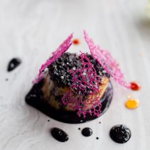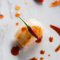 หอยเชลล์กับน้ำจิ้มซีฟู้ดหมึกดำ: เราต่างมักคุ้นเคยกับเมนูกุ้งเผาหรือปลาหมึกย่างกับน้ำจิ้มซีฟู้ดเสมอ ลองเปลี่ยนมาทานหอยเชลล์ย่างเนื้อแน่นสีขาว เสิร์ฟคู่กับน้ำจิ้มซีฟู้ดที่มีส่วนผสมของหมึกดำ ประดับหน้าตาด้วยบิสกิตมันม่วง