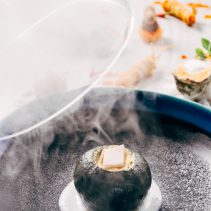 สังขยาฟักทอง: ฟักทองญี่ปุ่นลูกเล็กๆ มีรสชาติหวานมันพอดีตัว จึงสามารถนำมาทำฟักทองสังขยายที่สามารถรับประทานได้ทั้งลูกอย่างสบายๆ ขณะเตรียมเสิร์ฟจะนำมารมควันด้วยถ่านฟืนธรรมชาติ ซึ่งเป็นเทคนิคการทำขนมหม้อแกงดั้งเดิม ทำให้มีกลิ่นหอมน่ารับประทาน เป็นการทำเมนูขนมสังขยาที่มีกลิ่นการรมควันจากการทำขนมหม้อแกง