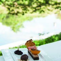 ก่อนนับถอยหลังเข้าสู่ปีใหม่ อย่าลืมเติมเต็มความหวานฉ่ำด้วยช็อคโกแลตมูสเค้กกับชีส ในเมนูสุดท้ายที่ชื่อว่า Peach Schnapps Genoise De Cacao ความโดดเด่นของเมนูนี้ คือ การใช้มิลค์ช็อคโกแลต และดาร์กช็อคโกแลตมารังสรรค์เป็นมูสเค้กที่มีเนื้อนุ่มละลายลิ้น พร้อมตกแต่งหน้าเค้กด้วยลูกพีชไซรัปที่เผาด้วยไฟอ่อนๆ ได้กลิ่นหอมยั่วใจจากผลไม้