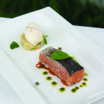 โปรดอย่าพลาดรายการซุปสูตรเด็ดกับเมนู Roasted Macadamia and Pumpkin Soup ซึ่งทางห้องอาหารได้คัดสรรฟักทองจากญี่ปุ่นมารังสรรค์เป็นซุปเนื้อข้น ทำให้ได้รสชาติหวานหอมของเนื้อฟักทองสีเหลืองนวลสวยอย่างเต็มคำไม่เหมือนที่ใด และตบท้ายด้วยเมนูล้างปากอย่าง Longan Sorbet ความโดดเด่นของเมนูนี้คือใช้ลำไยสด กับลำไยอบแห้งมาทำน้ำแข็งใสสไตล์ไทยๆ ตกแต่งหน้าตาด้วยแอปเปิ้ลเขียวอบกรอบ