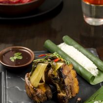 อีกเมนูนั่นคือ ซี่โครงหมูย่างกับผักดอง นำซี่โครงเนื้อหมูมาตุ๋นกับสมุนไพรเพื่อให้มีความนุ่มหอม แล้วจึงนำมาทอดกรอบ ต่อด้วยย่างพอประมาณ และ คลุกเคล้ากับซอสตระไคร้เพื่อให้มีกลิ่นหอมความเป็นไทย เสิร์ฟพร้อมกับกิมจิที่ทำจากผักฉ่อยหมักดองกับ ตระไคร้ซอย ใบมะกรูด ต้นหอม น้ำเชื่อมน้ำตาล และ เกลือ เพื่อให้เกิดรสชาติเปรี้ยวอมหวานตัดลงตัวกับซี่โครงหมูพอดิบพอดี”