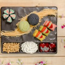Japanese inspired, charcoal crepes are used in lieu of seaweed to create the candy sushi! Served with 2 ice-cream flavoured and all sorts of accoutrements.