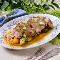 2. Spiced pork chop and grilled avocado A overnight brined pork chop, sumac spice rub, sautéed zucchini and roasted vegetables puree. (We brine the pork chop overnight to ensure it stays nice and moist in the inside.)
