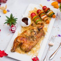 Roasted Half Chicken: เมื่อเอ่ยถึงอาหารจานยอดนิยมในวันคริสต์มาสแล้ว เราต่างนึกถึงไก่งวงวางประดับบนโต๊ะ รายล้อมไปด้วยขนมหวาน และกล่องของขวัญ ซึ่งเชฟขวัญล่าได้นำไก่สาวที่มีเนื้อนุ่มและไม่เหนียวจนเกินไป น้ำหนักอยู่ระหว่าง 800 กรัม – 1 กิโลกรัม มาหมักเครื่องเทศข้ามคืนและนำมาอบจนสุกหอม เสิร์ฟพร้อมผักย่างเสียบไม้ และซอสรสกลมกล่อม